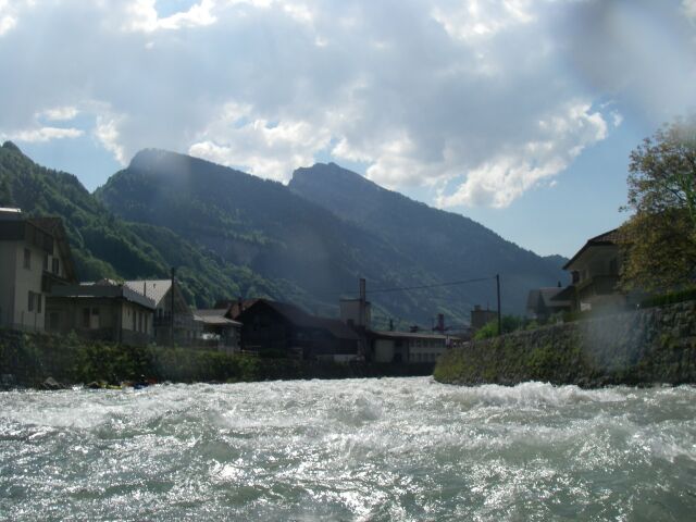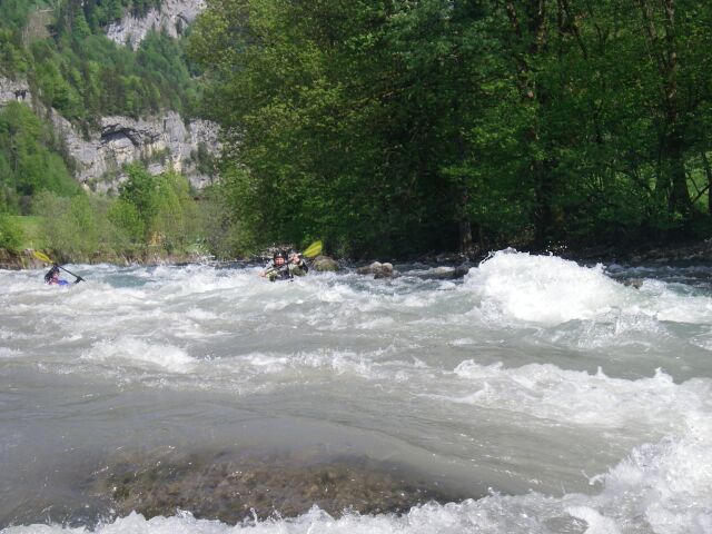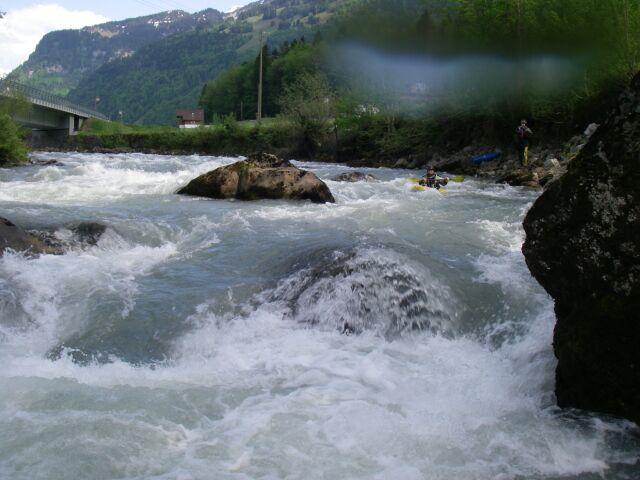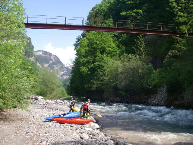 nel paese di Muota sponde alte articiali, dopo il ponte lungo in cemento della statale e sotto il ponte dello sbarco le rapide più impegnative (III+)